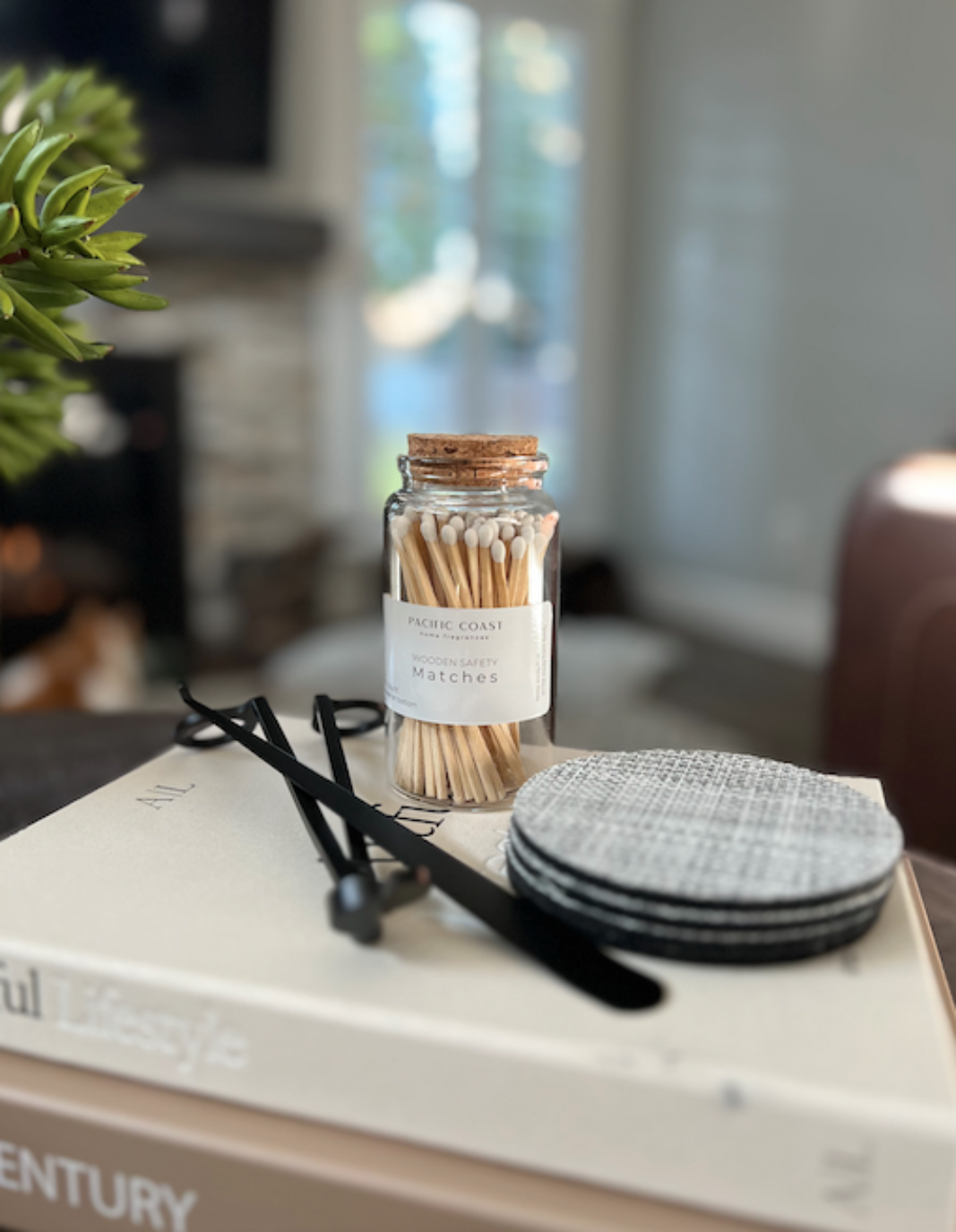 Our Wooden Safety Matches are the perfect companion to any candle. Both a piece of decor and functional, these 4" white-tip matches come in a modern glass jar with a cork lid. Ideal for styling a candle tray, or pairing with a gift for a finishing touch.